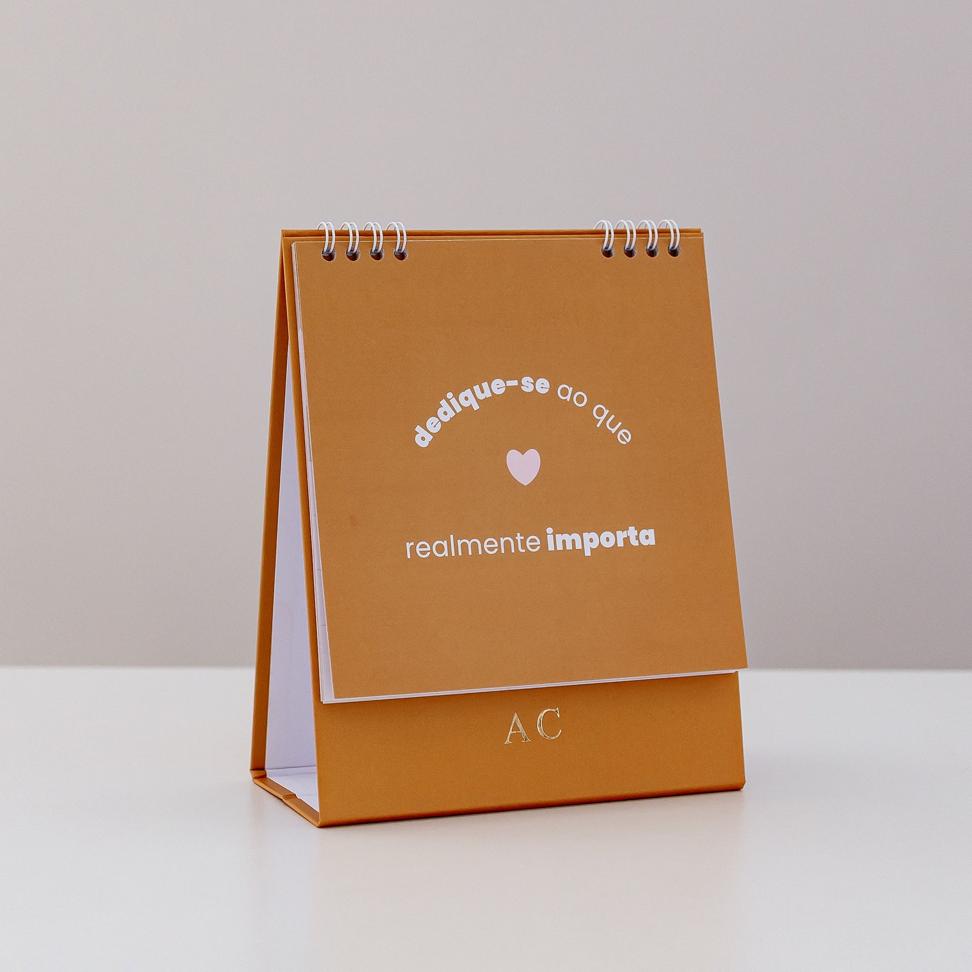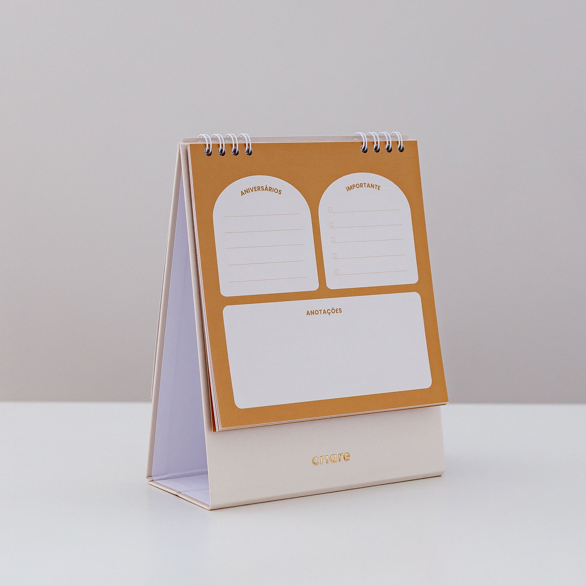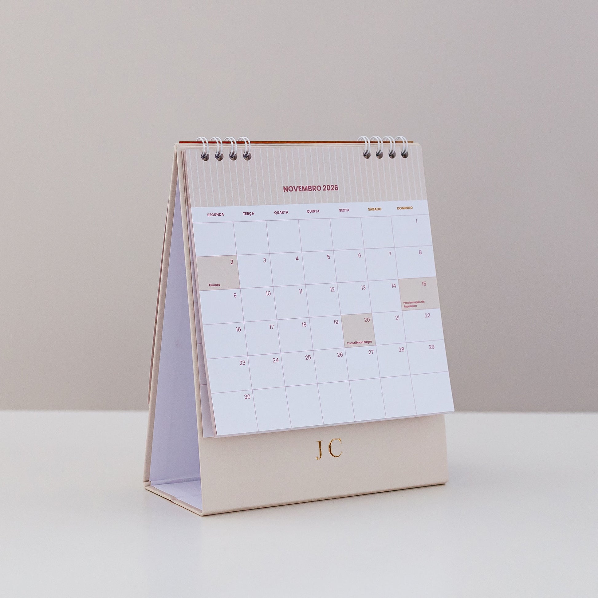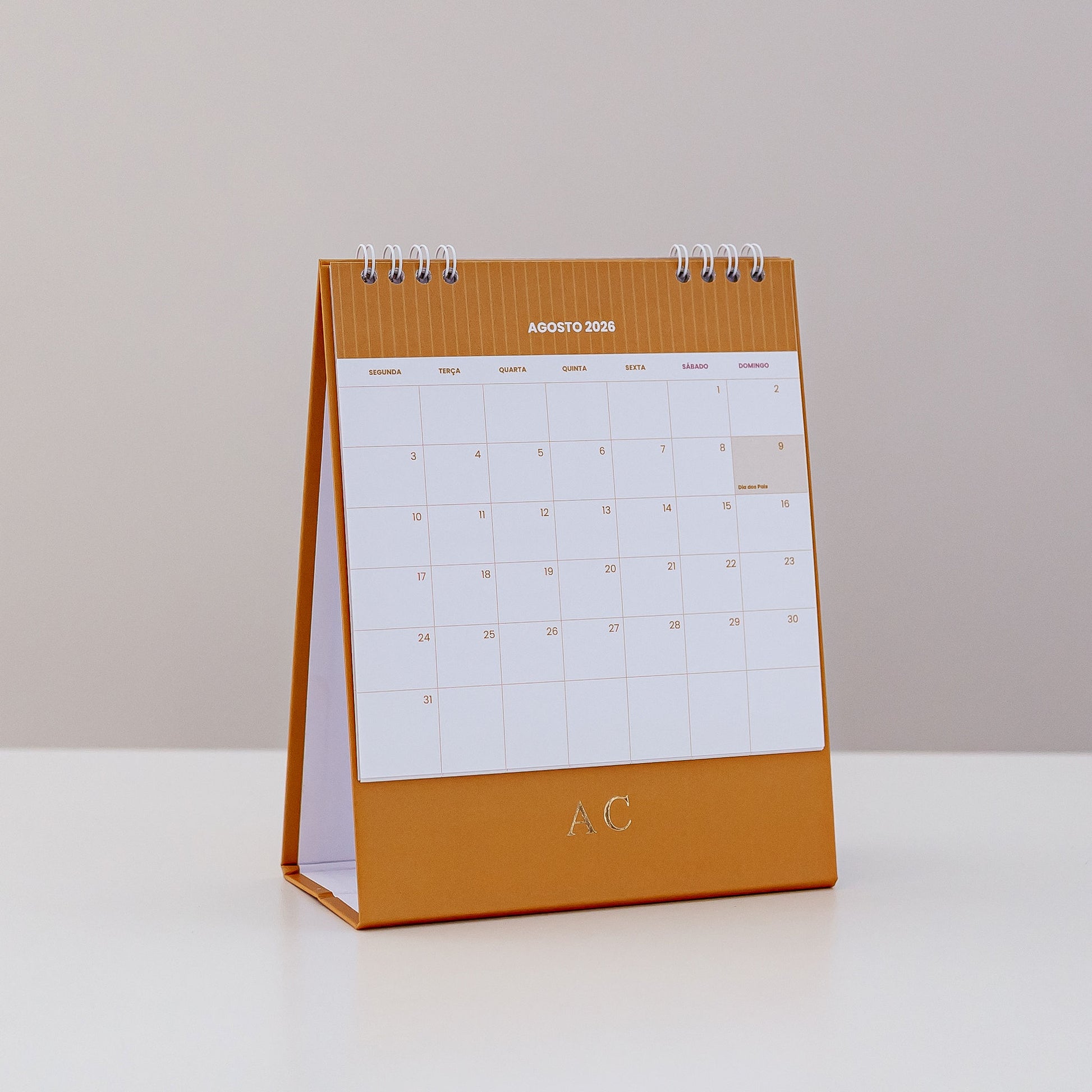 O calendário está disponível em duas opções de capas: caramelo e baunilha. Cores lindas que combinam com qualquer ambiente! Ele possui base rígida, garantindo resistência ao uso diário. Aproveite para colocar suas iniciais e personalizar ainda mais sua mesa de trabalho e estudos.