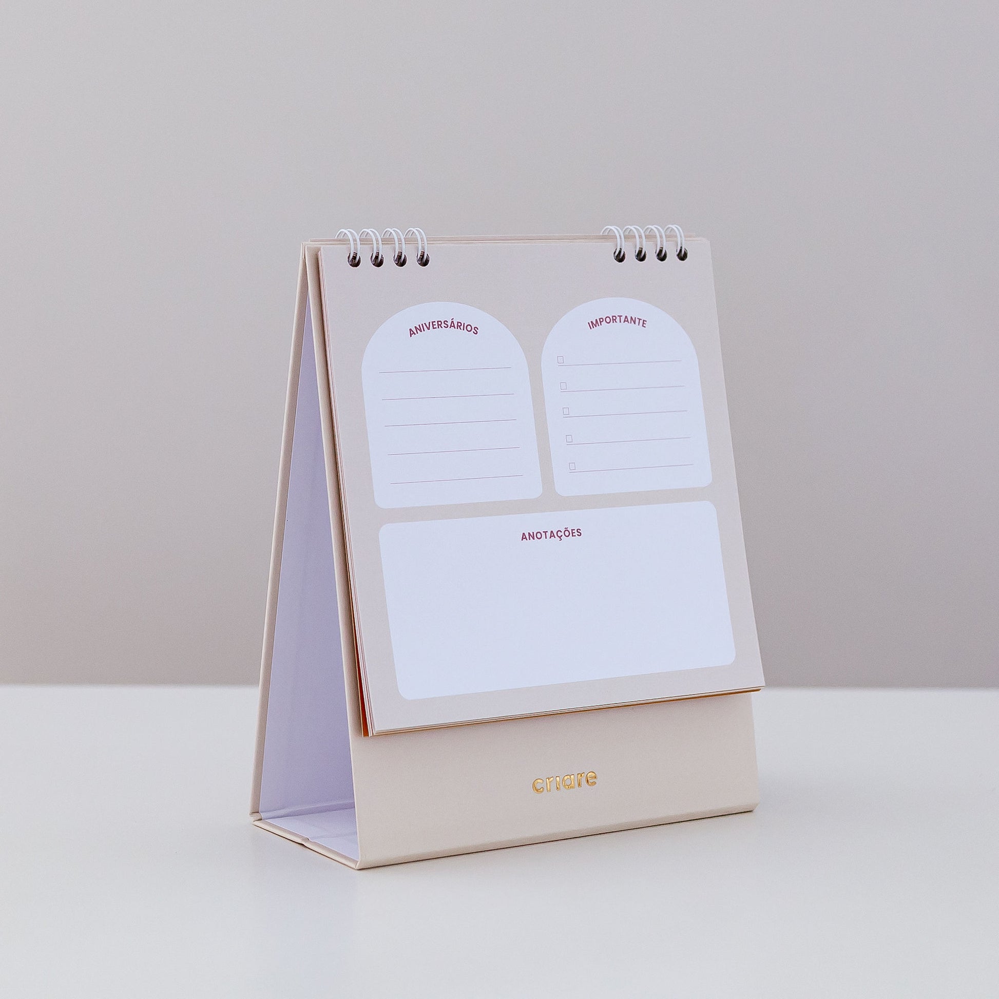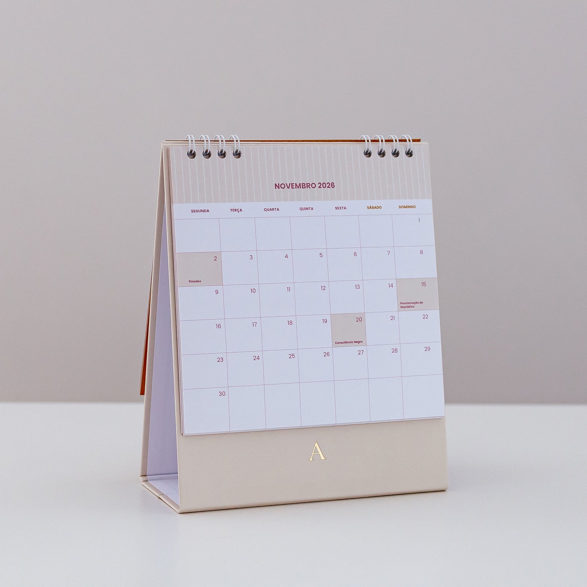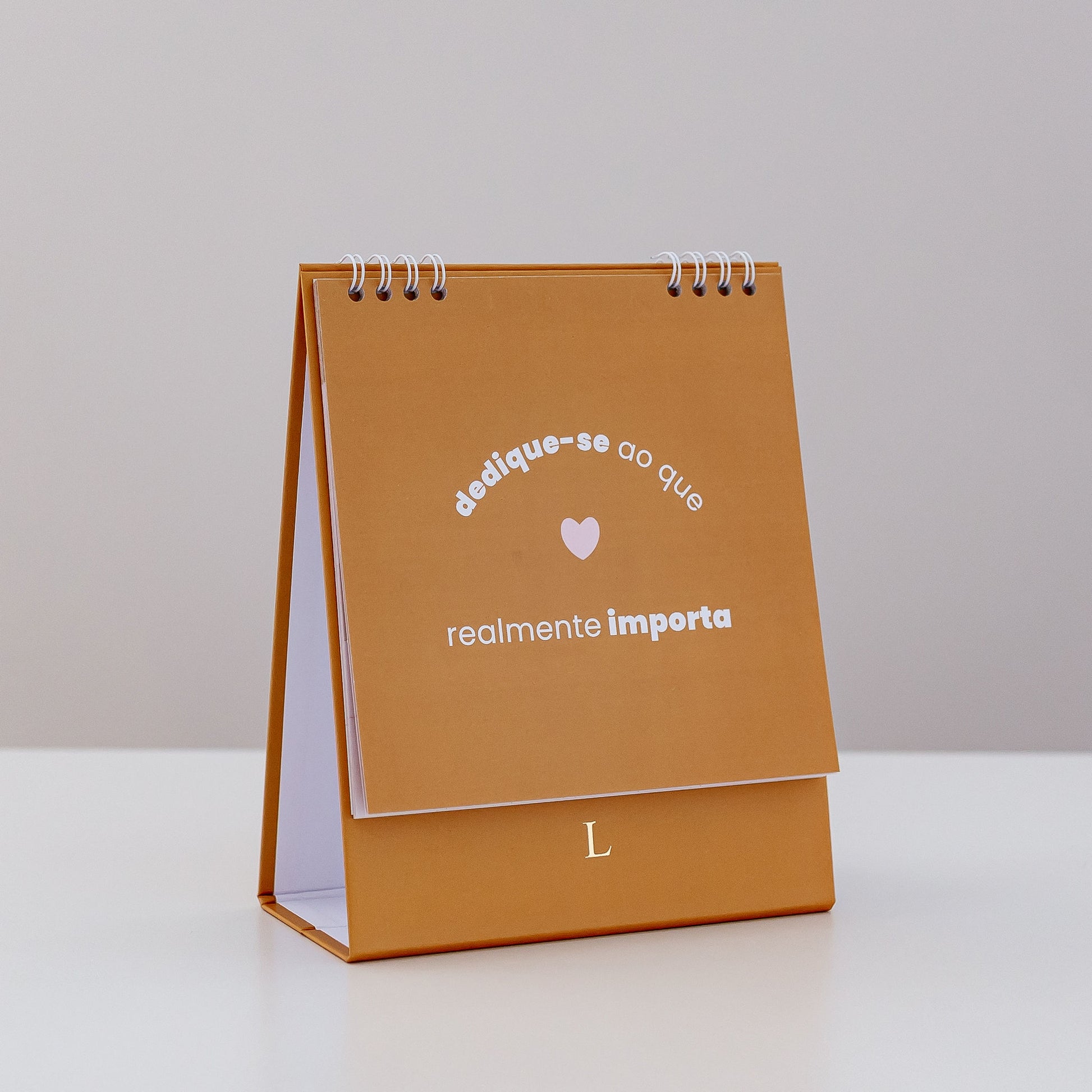 O calendário está disponível em duas opções de capas: caramelo e baunilha. Cores lindas que combinam com qualquer ambiente! Ele possui base rígida, garantindo resistência ao uso diário. Aproveite para colocar suas iniciais e personalizar ainda mais sua mesa de trabalho e estudos.