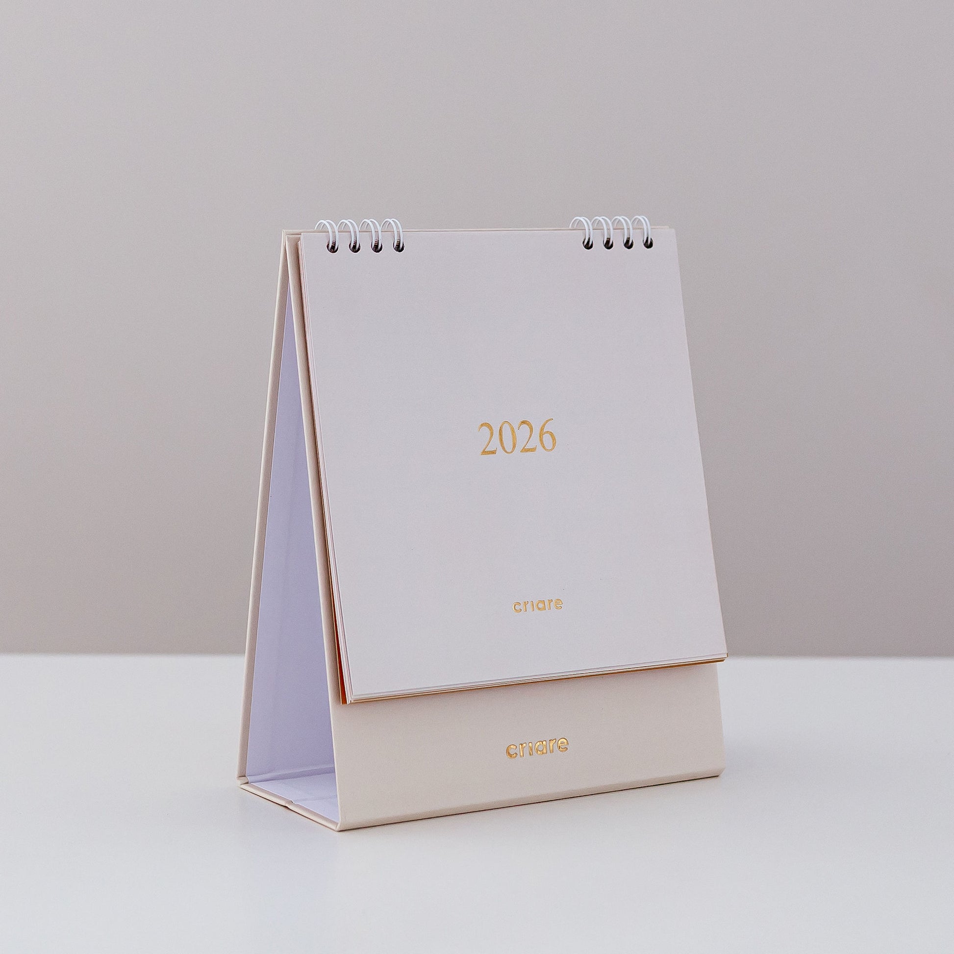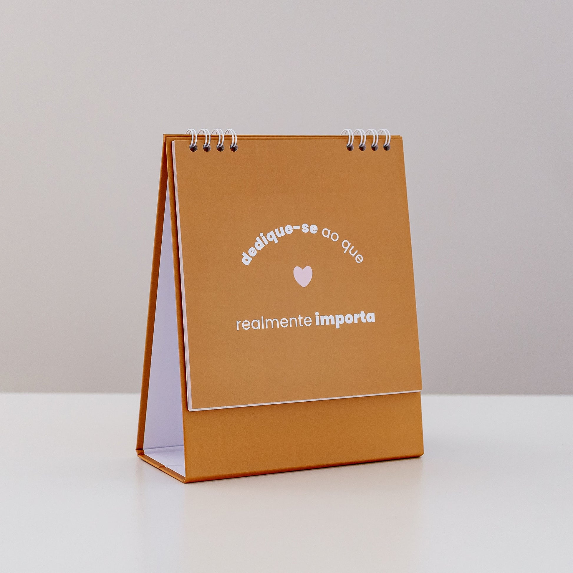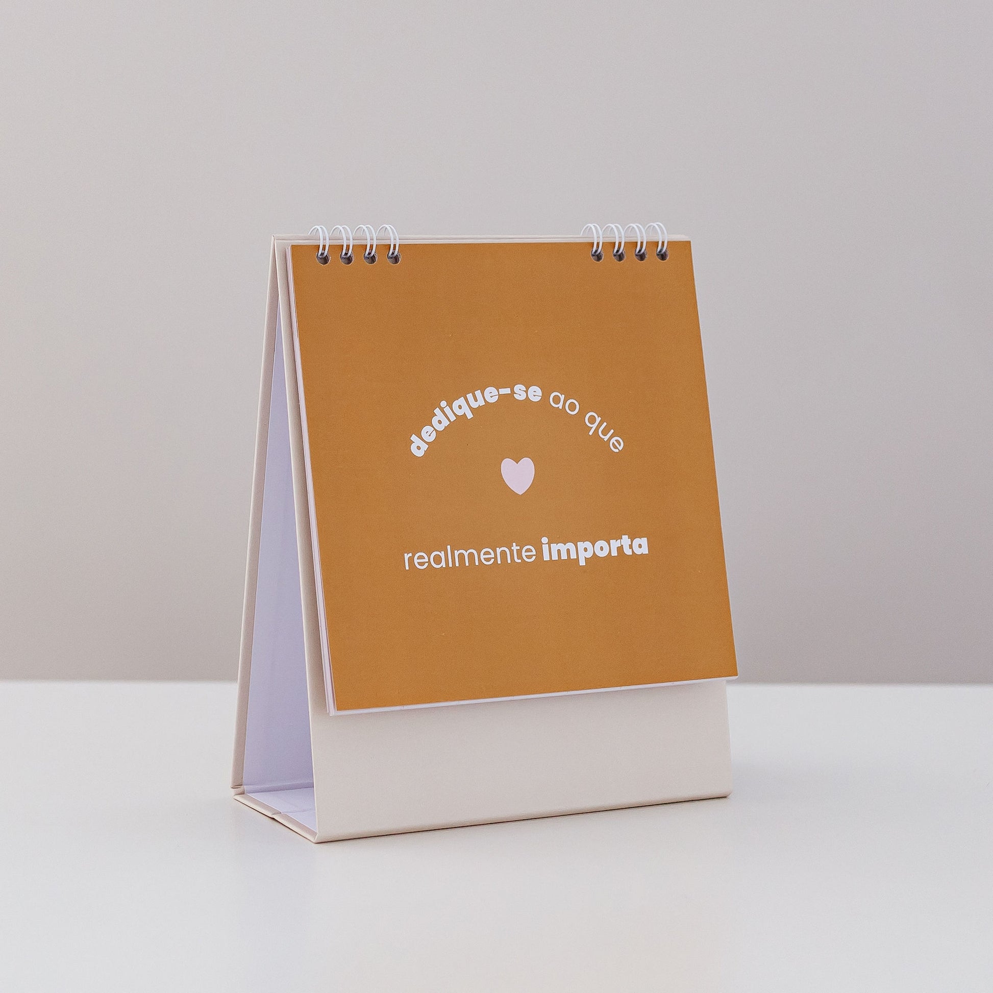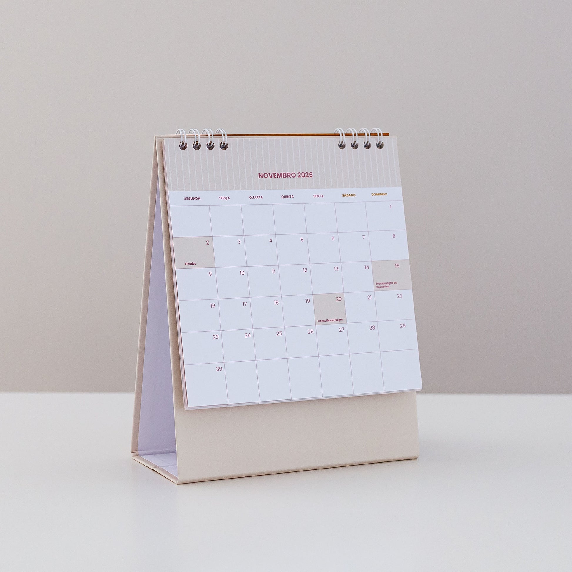 O calendário está disponível em duas opções de capas: caramelo e baunilha. Cores lindas que combinam com qualquer ambiente! Ele possui base rígida, garantindo resistência ao uso diário. Aproveite para colocar suas iniciais e personalizar ainda mais sua mesa de trabalho e estudos.