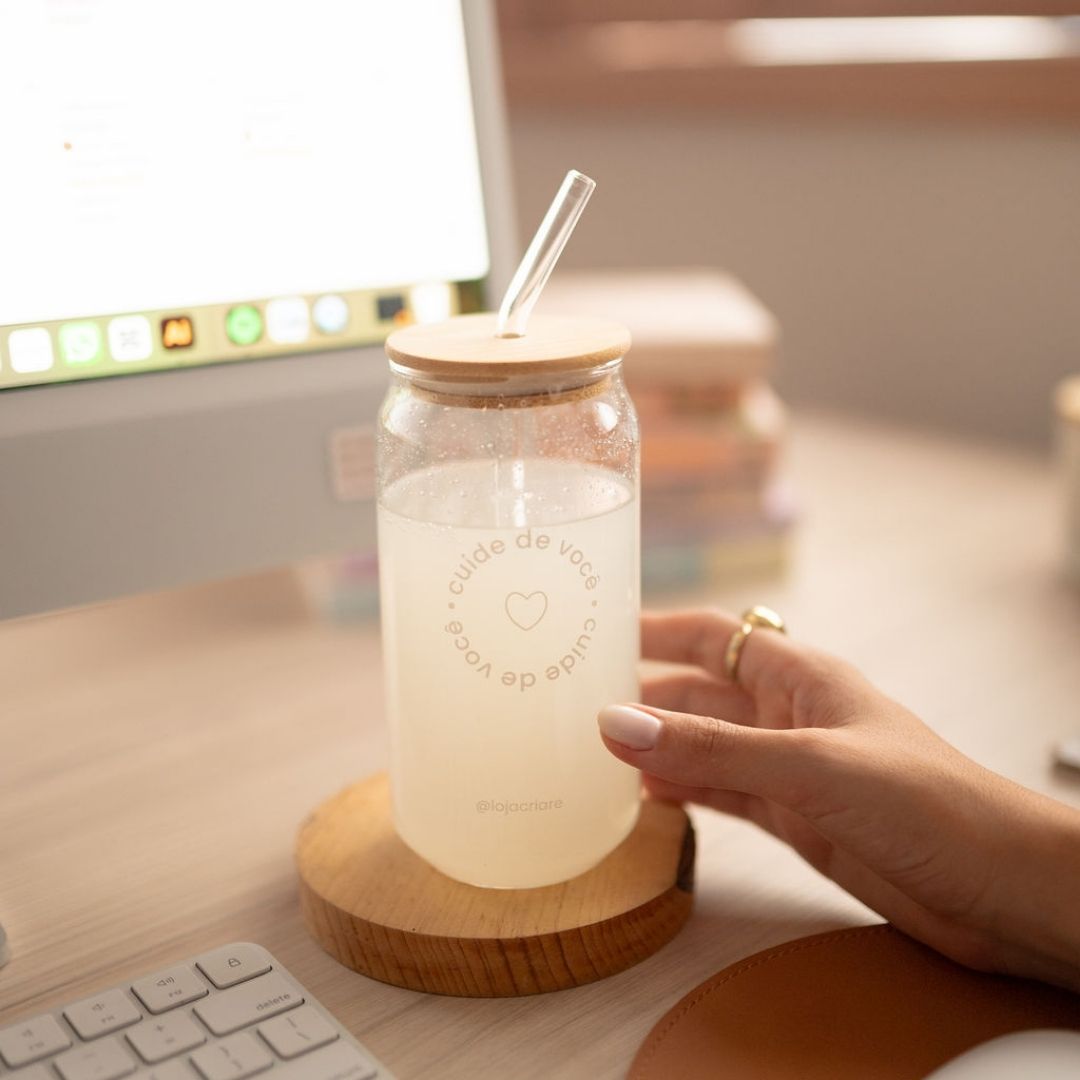 O Copo Perfeito foi pensado para acompanhar sua rotina com mais leveza. Feito em vidro e com design delicado, ele vem com tampa de bambu e canudo de vidro, ideal para cafés gelados, sucos, chás e bebidas refrescantes.