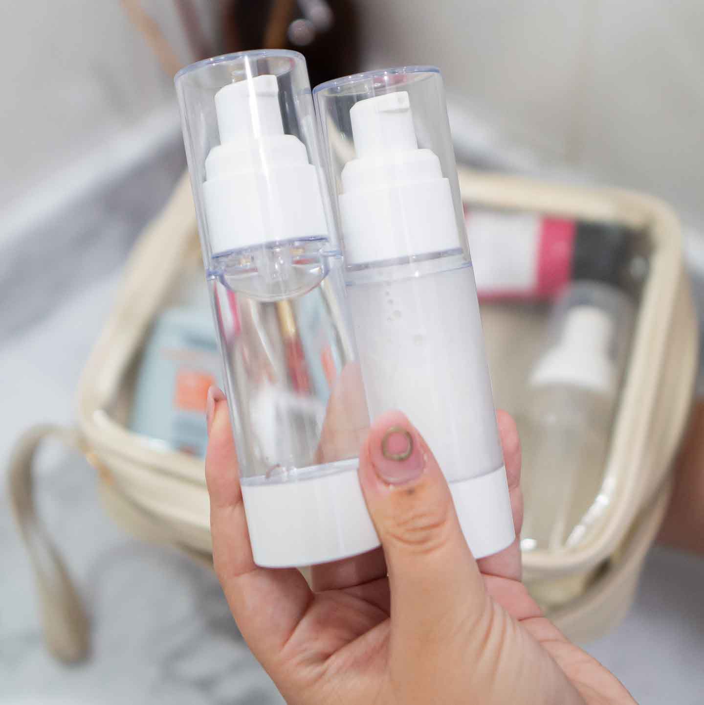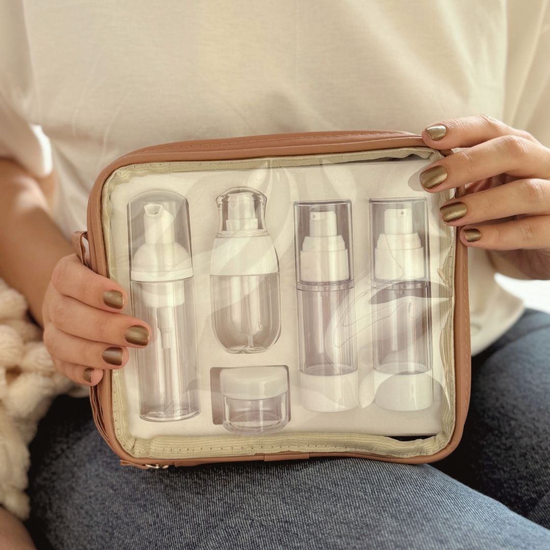 A necessaire já vem com 5 frascos reutilizáveis de alta qualidade, perfeitos para transportar seus produtos favoritos. Além de adesivos a prova d'água para etiquetá-los!!