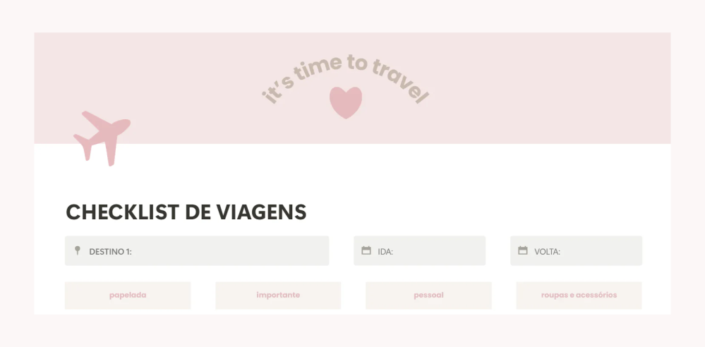Uma lista completa de itens indispensáveis para suas viagens separados por categorias! Acrescente seus preferidos e se organize com o nosso checklist.