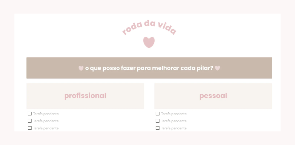 Analise seu nível de satisfação em cada um dos pilares da sua vida. Mas fique atenta aos temas, assim você pode entender quais áreas estão precisando de mais atenção na sua rotina: profissional, pessoal, relacionamentos ou qualidade de vida <3